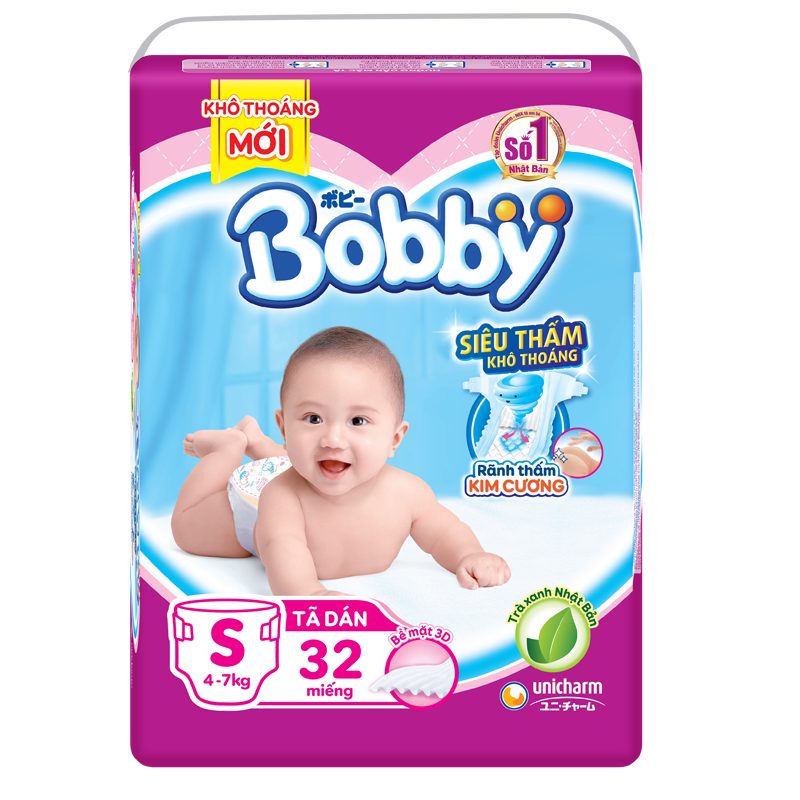 Tã - bỉm dán Bobby S32 (4-7kg) được ứng dụng công nghệ RÃNH THẤM KIM CƯƠNG đột phá, nâng cao khả năng thấm hút, cho bé luôn khô thoáng. Chất liệu bông mềm mại kết hợp tinh chất trà xanh thơm mát, ngăn ngừa hăm tã cho bé.
