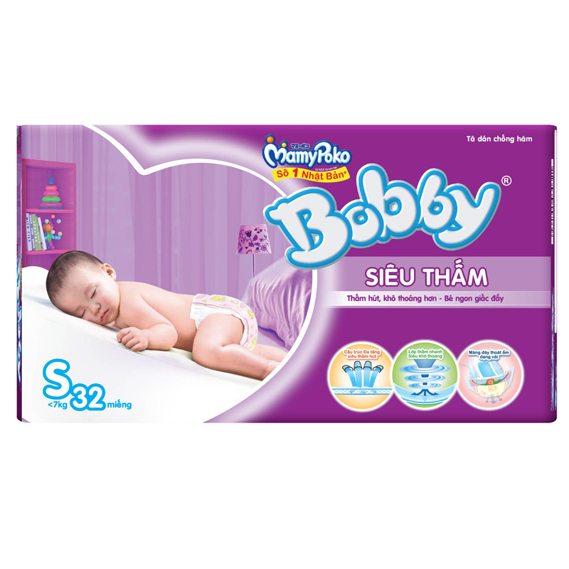 Tã - bỉm dán Bobby S32 với lõi bông siêu dẫn thấm, độ thấm hút tối đa sẽ ngăn ngừa những khả năng để xảy ra sự đọng vũng, ẩm ướt…nên rất thích hợp cho bé sử dụng vào ban đêm, để trẻ có giấc ngủ sâu, không bị giật mình tỉnh giấc. Sản phẩm gồm 32 miếng size S cho bé dưới 6kg, chất liệu bông cao cấp đã qua kiểm định chất lượng nghiêm ngặt.
