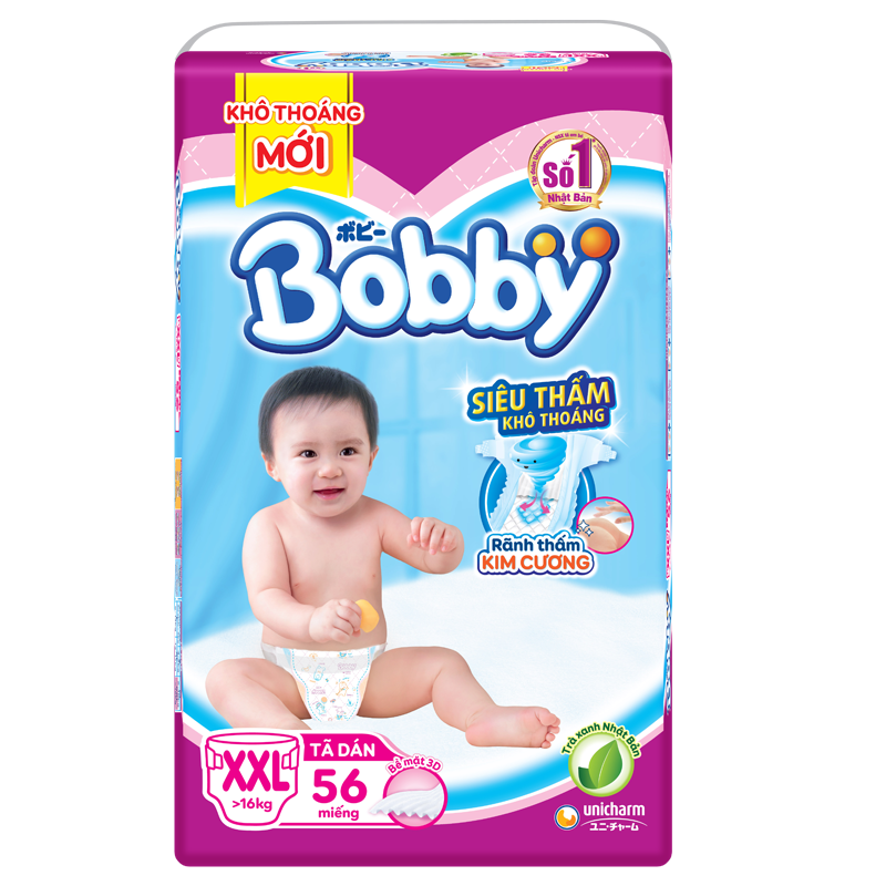 Ứng dụng công nghệ từ Unicharm, tã - bỉm dán Bobby XXL56 với cải tiến mới rãnh thấm kim cương, siêu thấm hút giữ cho bề mặt bỉm luôn khô ráo, thoáng khí đồng thời giảm tiếp xúc giữa da bé với chất bẩn. Ngoài ra, đai dính co giãn Magic-Fit vừa vặn linh hoạt thoải mái cùng màng đáy thoát ẩm cho da bé luôn thoải mái, ngủ tròn giấc.