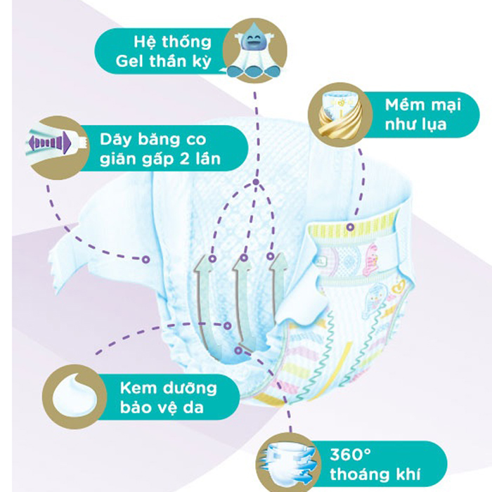 - Bổ sung sữa dưỡng thể đặc biệt: bề mặt tã tiếp xúc và ôm sát làn da bé được phủ một lớp dưỡng thể đặc biệt giúp chăm sóc làn da mỏng manh của bé một cách nhẹ nhàng