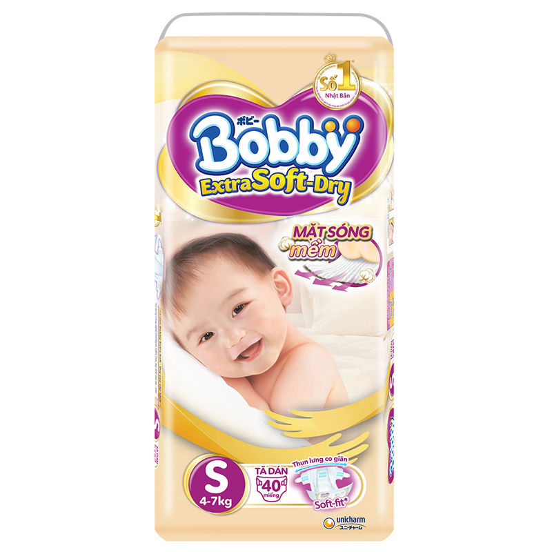 Tã dán Bobby Extra Soft - Dry cao cấp size S được sản xuất dưới công nghệ Unicharm độc quyền, sử dụng chất liệu êm ái, dịu nhẹ cho da. Cấu tạo bề mặt dạng sóng giúp thấm hút siêu tốc đồng thời hạn chế tiếp xúc giữa da với chất thải, cho da bé luôn khô thoáng, sạch sẽ.