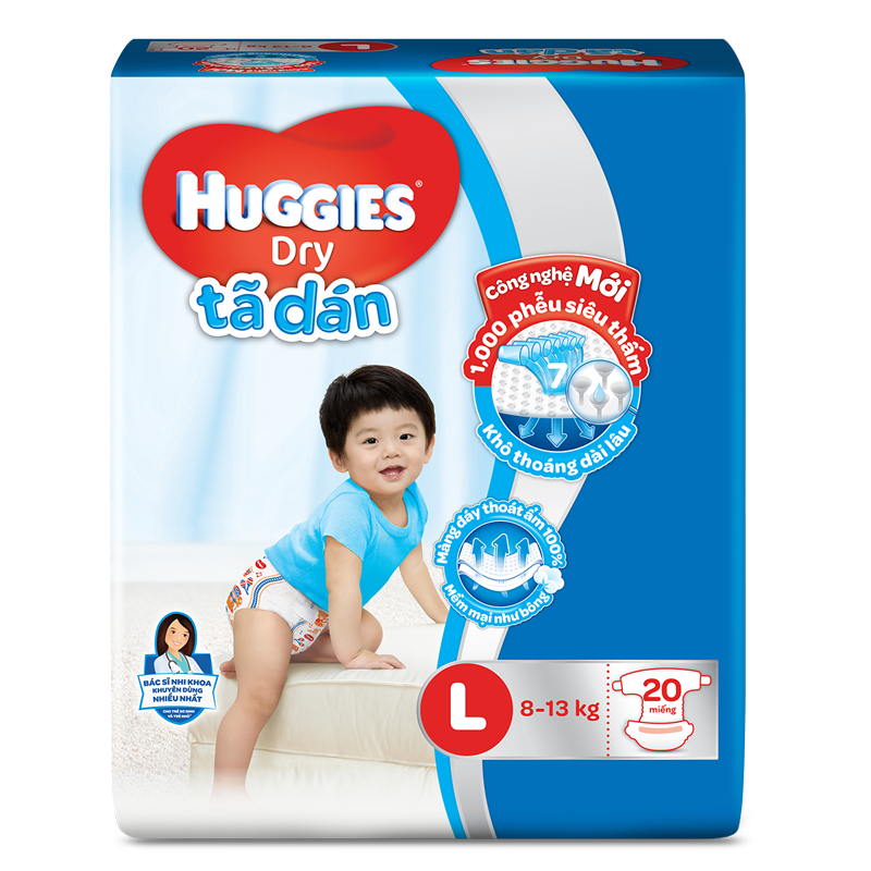 Bỉm dán Huggies L20 được sản xuất dựa trên công nghệ hiện đại với các lõi bông kết hợp hạt thấm hút, giúp trẻ luôn khô thoáng suốt ngày và đêm. Tã sở hữu độ thoáng khí tốt, có khả năng chống hăm nên mang lại cảm giác thoải mái và dễ chịu tuyệt đối cho bé.