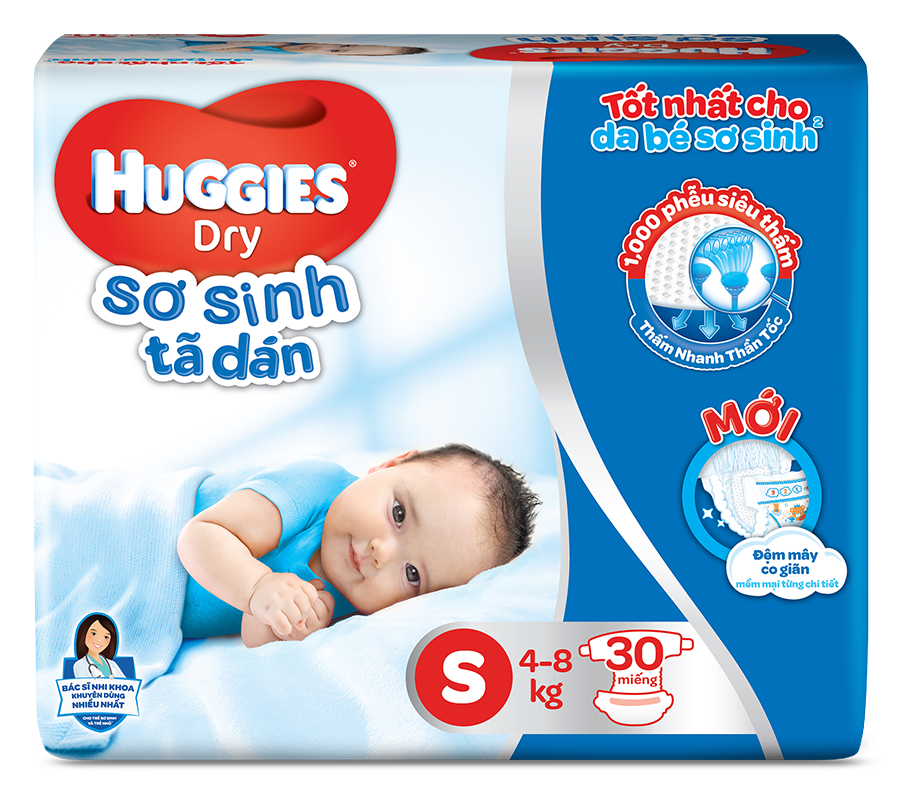 Tã - Bỉm dán Huggies S30 (4-8 kg) làm từ chất liệu khử mùi, chống hăm da, thấm hút an toàn, chống tràn hiệu quả giúp bé thoải mái vui chơi và ngủ ngon hơn, trong khi mẹ dễ dàng vệ sinh cho bé. Hãy chăm sóc bé với tã dán Huggies giúp bé khô thoáng suốt ngày.