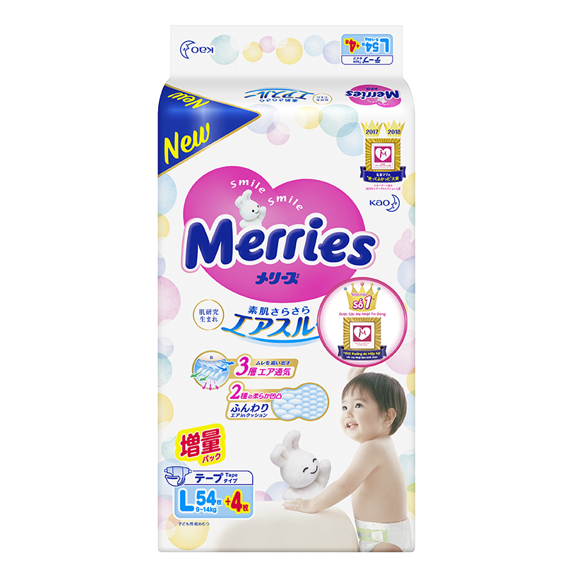 Tã - Bỉm dán Merries L54 + 4 miếng (9-14kg) với cải tiến đột phá, công nghệ Đệm Khí Siêu Mềm Cao Cấp đến từ Nhật Bản, siêu thấm hút và siêu thoáng, chống hăm cho bé. Sản phẩm với đóng gói to hơn mà mức giá vẫn giữ nguyên.