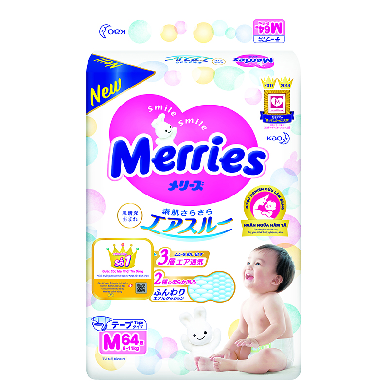 Bỉm Merries M64 được sản xuất theo công nghệ Nhật Bản an toàn và không gây kích ứng da dành cho các bé từ 6kg - 11kg