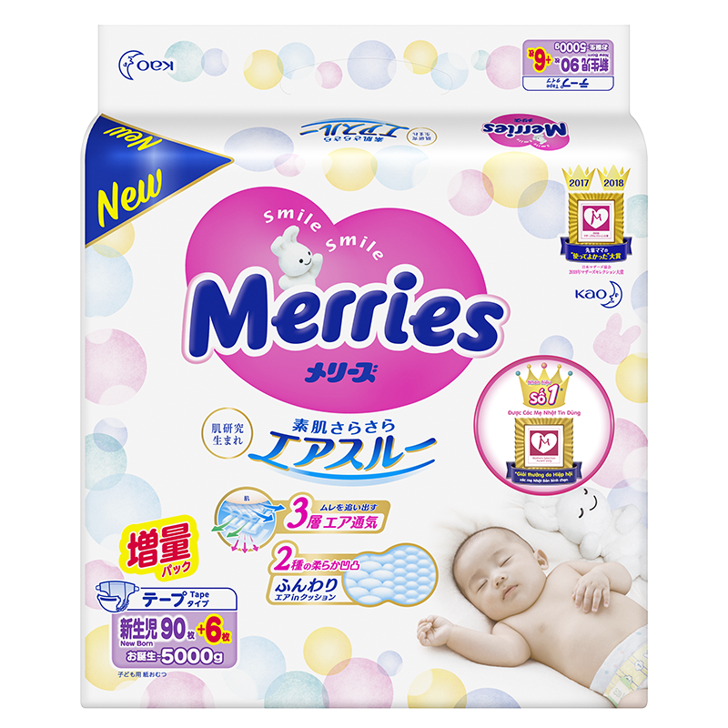 Tã - Bỉm dán Merries Newborn NB90 + 6 miếng (<5kg) với cải tiến tốc độ thấm hút nhờ tăng thể tích khí GẤP 3 LẦN trên bề mặt bông tiếp xúc điểm, không còn lo lắng nước tiểu đọng trên da bé. Đặc biệt, loại mới được thêm 6 miếng với mức giá vẫn giữ nguyên, cực kỳ tiết kiệm cho mẹ.