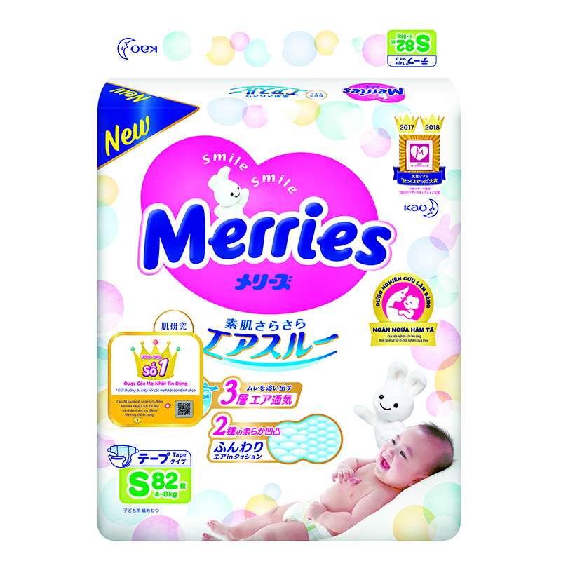 Bỉm Merries S82 được sản xuất theo công nghệ Nhật Bản an toàn và không gây kích ứng da dành cho các bé từ 4kg - 8kg