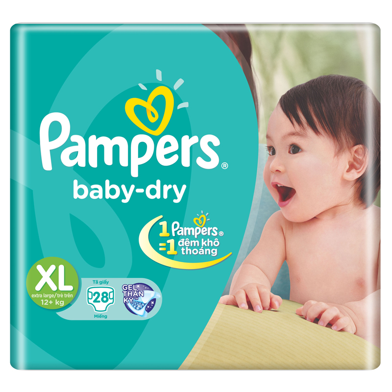 Bỉm Pampers XL28 dành cho bé trên 12kg. Bỉm Pampers với lớp “lõi thần kỳ” với khả năng thấm hút tốt (đến 10 tiếng mà vẫn khô thoáng), đặc biệt là rất mỏng, mềm, nhẹ nên rất thoải mái cho bé khi phải mặc trong thời gian dài. Pampers được tăng cường miếng lót siêu thấm - thấm hút đến 6 lần bé tè và giữ bề mặt da bé khô thoáng thơm mát đến sáng. Với mặt đáy mềm mại như bông và miếng dán nhiều lần vẫn chắc chắn, tã Pampers chính là sản phẩm giúp bé thoải mái ngủ, chơi đùa mà mẹ không mất quá nhiều thời gian để chăm sóc bé.