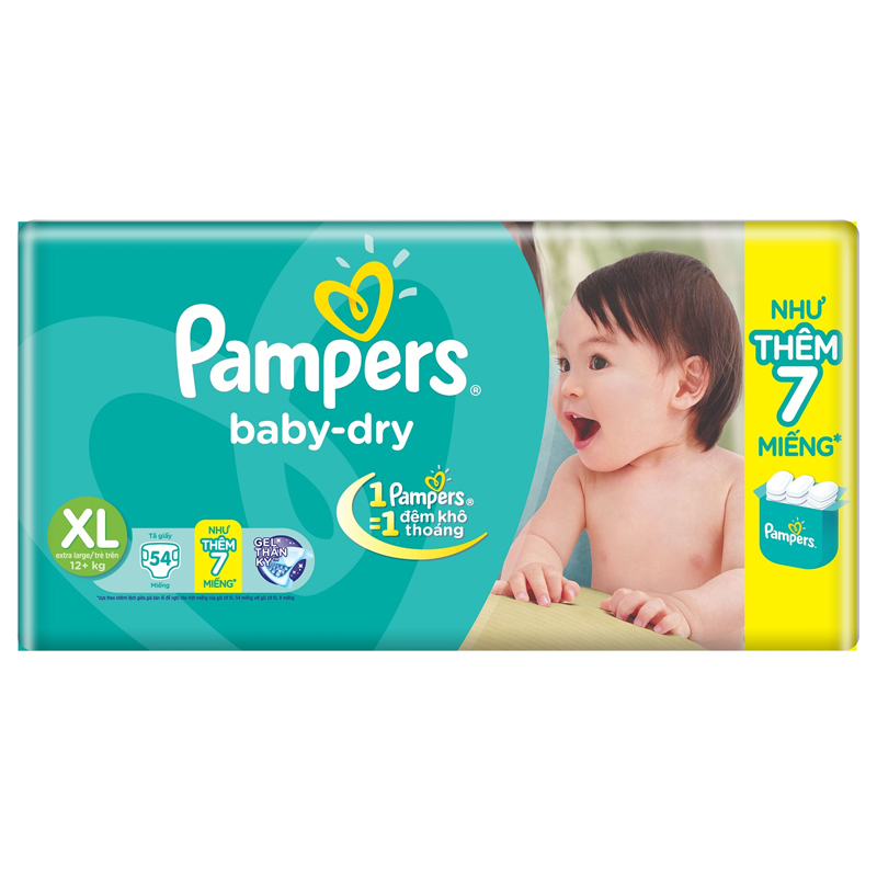 Bỉm Pampers XL54 dành cho bé trên 12kg. Bỉm Pampers với lớp “lõi thần kỳ” với khả năng thấm hút tốt (đến 10 tiếng mà vẫn khô thoáng), đặc biệt là rất mỏng, mềm, nhẹ nên rất thoải mái cho bé khi phải mặc trong thời gian dài. Pampers được tăng cường miếng lót siêu thấm - thấm hút đến 6 lần bé tè và giữ bề mặt da bé khô thoáng thơm mát đến sáng. Với mặt đáy mềm mại như bông và miếng dán nhiều lần vẫn chắc chắn, tã Pampers chính là sản phẩm giúp bé thoải mái ngủ, chơi đùa mà mẹ không mất quá nhiều thời gian để chăm sóc bé.