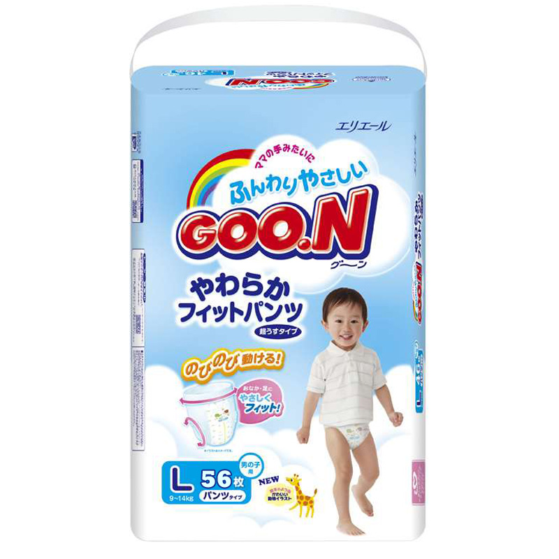 Bỉm Goon nội địa L56 với tính năng nổi trội là mềm mỏng, khô thoáng. Goon được thừa nhận là sản phẩm tốt nhất trong việc chống hăm da, bảo vệ làn da mềm mại của bé, quần giấy Goon đã được hầu hết các bà mẹ trên toàn nước Nhật công nhận.