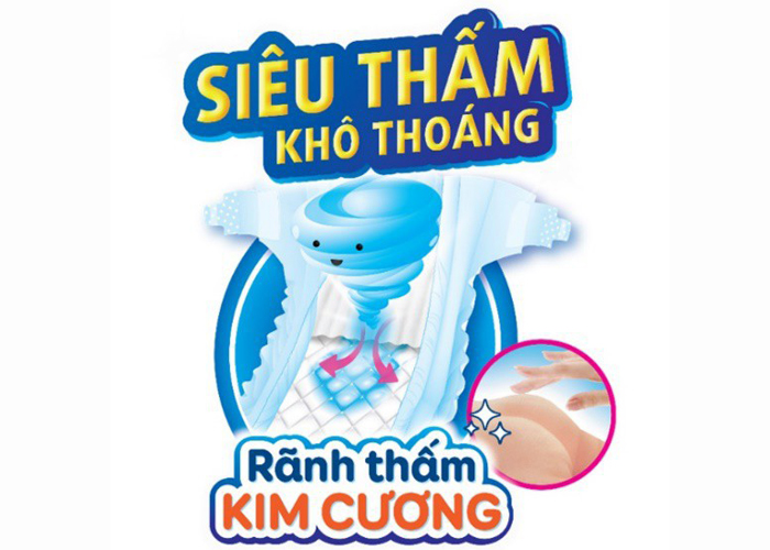 • Thấm nhanh, dàn đều: Lõi thấm hút với rãnh kim cương giúp chất thải dẫn thấm nhanh chóng và dàn đều theo các đường rãnh dạng ô, giảm tình trạng vón cục, cho miếng tã thêm mỏng nhẹ.
