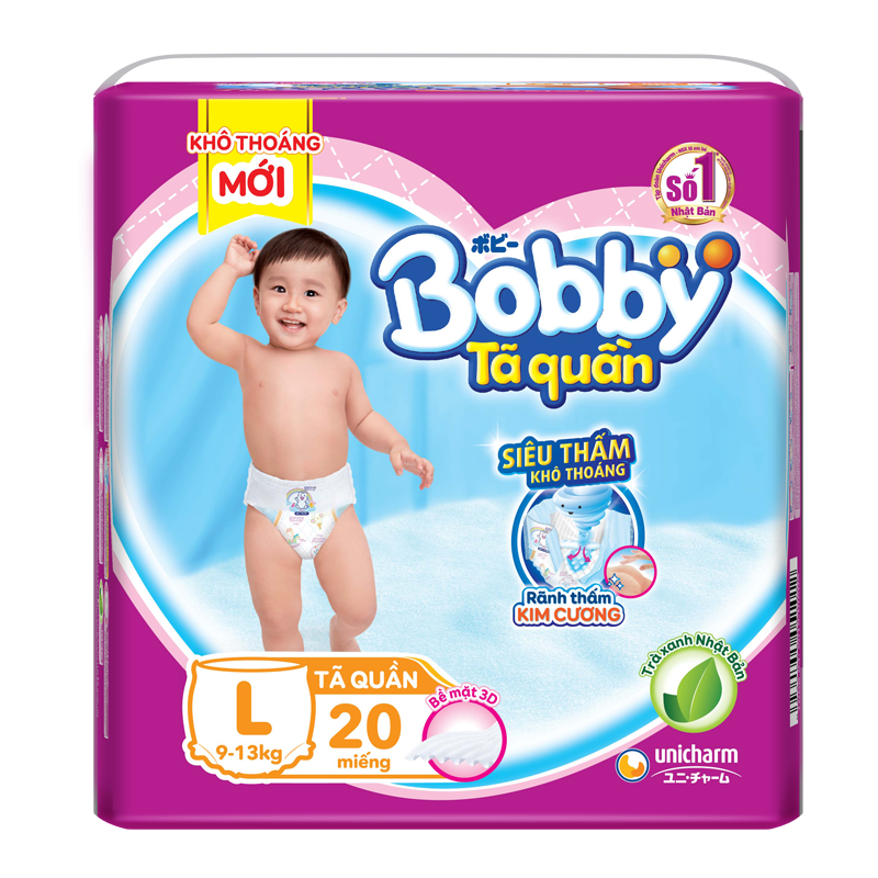 Bỉm quần Bobby L20 dùng cho trẻ từ 9 đến 13kg với lõi bông siêu thấm giúp bé luôn khô thoáng cùng với đai hông co giãn mềm mại cho bé thoải mái vận động. Sản phẩm được thiết kế với bề mặt dạng sóng 3D giúp giảm diện tích tiếp xúc giữa da và chất bẩn, nay kết hợp cùng cải tiến MỚI - Rãnh Thấm Kim Cương khiến chất lỏng dễ dàng thấm nhanh, dàn đều và bị khóa chặt, ngăn chặn việc thấm ngược trở lại gây ẩm ướt, khó chịu cho bé.