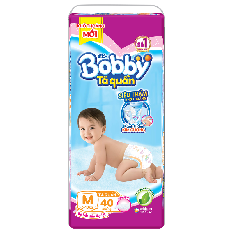 Tã - bỉm quần Bobby M40 (gói lớn) tiết kiêm hơn cho mẹ, dùng cho trẻ từ 6 đến 10kg với lõi bông siêu thấm giúp bé luôn khô thoáng cùng với đai hông co giãn mềm mại cho bé thoải mái vận động. Thiết kế dạng quần rất thuận tiện, đai hông co giãn mềm mại thật vừa vặn cho bé; lõi bông siêu thấm hút cùng mặt đáy thoát hơn ẩm dạng vải siêu thoáng khí.