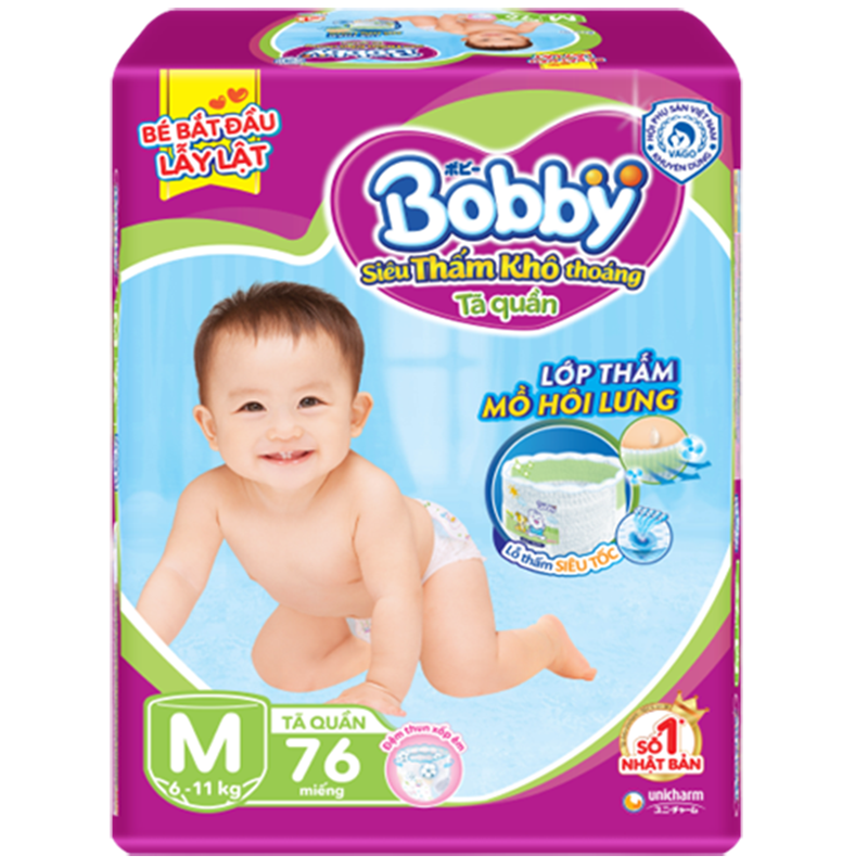 Tã - Bỉm quần Bobby trà xanh M76 với thiết kế ngộ nghĩnh, giúp bé thoải mái khi vận động, vui chơi mà vẫn khô thoáng suốt cả ngày. Bỉm Bobby dành cho bé từ 6 - 11 kg với mặt đáy thoát hơi, đệm lưng thấm mồ hôi có tác dụng chống hăm da cho bé và chống khuẩn rất tốt. Thiết kế gói lớn sẽ tiết kiệm thời gian cho mẹ khi mua sắm. Mẹ sẽ có nhiều thời gian hơn để chăm sóc bản thân và gia đình bé nhỏ của mình