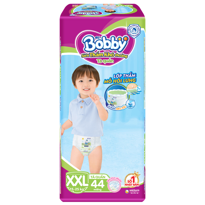 Bỉm quần Bobby XXL44 ứng dụng công nghệ Unicharm - Nhật Bản với đệm lưng thấm mồ hôi cùng 3000 lỗ thấm siêu tốc chống tràn, thấm hút nhanh, thun hông linh hoạt ôm vừa vặn cho bé tự do thoải mái vận động mà mẹ không lo bé bị xô lệch tã. Sản phẩm được sản xuất theo công nghệ của Nhật Bản, an toàn, mềm mại với làn da nhạy cảm của trẻ.
