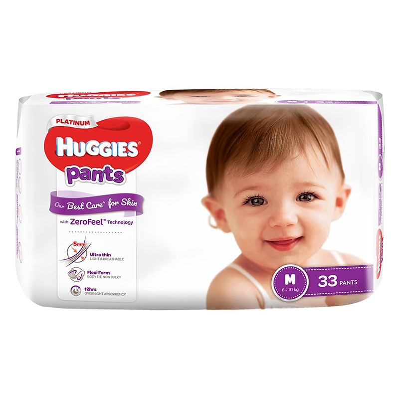 Ngoài công nghệ ZEROFEEL™ với thiết kế mỏng nhẹ chỉ 5mm mà vẫn thấm hút vượt trội lên đến 12 giờ, bỉm quần cao cấp Huggies Platinum M33 (6-10kg) còn cải tiến với thiết kế lưng co giãn không đường thun, ôm vừa vặn không gây hằn đỏ cho bé thoái mái trong mọi cử động.