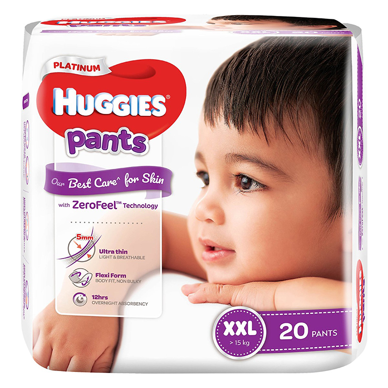 Tã bỉm quần cao cấp Huggies Platinum XXL20 (>15kg) với thiết kế không những siêu mỏng mà còn chứa hơn 100 triệu lỗ thoáng khí giúp da bé thoáng mát nhẹ tênh. Sản phẩm có cải tiến với thiết kế lưng co giãn không đường thun, ôm vừa vặn không gây hằn đỏ cho bé thoái mái trong mọi cử động