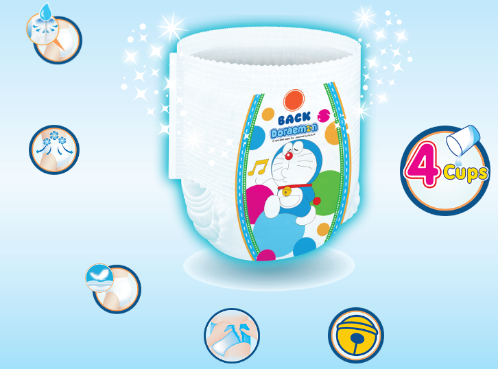 + Bao bì thiết kế mới với hình ảnh chú mèo máy Doraemon làm trung tâm và 10 hình ảnh Doraemon dễ thương xuất hiện ngẫu nhiên trên từng miếng tã thu hút bé giúp việc thay tã của mẹ trở nên dễ dàng hơn.