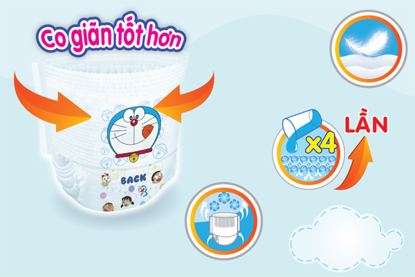 Đây cũng là những màu sắc chủ đạo, tượng trưng cho sự gần gũi, trẻ trung và năng động, được sử dụng cho thiết kế logo cũng như bao bì, mang lại mẫu mã hoàn toàn mới. Mặt ngoài miếng tã cũng được thiết kế màu sắc sinh động hơn với hình ảnh chú mèo máy Doremon đáng yêu, ngộ nghĩnh. Chắc chắn điều này sẽ khiến bé yêu “thích mê” với những người bạn mới.