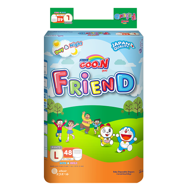 Bỉm quần Goon Friend L48 với nhiều cải tiến đáng kể, hướng tới thị trường phân khúc phổ thông với giá cả hợp túi tiền nhưng sở hữu chất lượng vượt trội. GOO.N Friend vẫn giữ nguyên đặc tính nổi bật của mình là: siêu mỏng – siêu thấm – siêu khô thoáng và ngừa hăm hiệu quả. Nhưng sản phẩm thiết kế mềm mại, thoát hơi ẩm nhanh chóng cùng họa tiết chú mèo máy Doremon đáng yêu, ngộ nghĩnh.