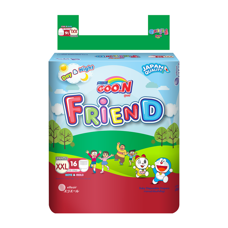 Hướng tới thị trường phân khúc phổ thông với giá cả hợp túi tiền nhưng sở hữu chất lượng vượt trội, bỉm quần Goon Friend XXL16 được nhiều mẹ Việt lựa chọn cho bé yêu của mình. Với cải tiến, lưng thun co giãn linh hoạt nhất là các vùng thun hông, đùi có khả năng đàn hồi tốt, nhẹ nhàng ôm khít vòng mông và cho bé cảm giác thoải mái, họa tiết doremon ngộ nghĩnh.