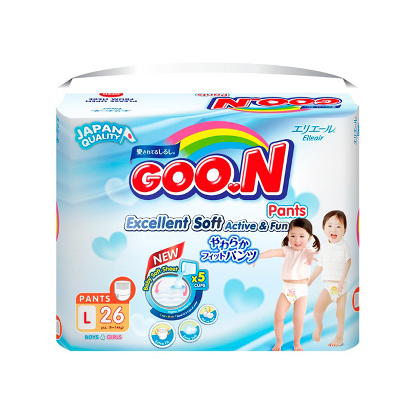 GOO.N trong tiếng Nhật có nghĩa là “tã giấy tốt” và “chóng lớn”. Với tôn chỉ luôn mang tới những điều tốt nhất dành cho bé, GOO.N luôn cố hoàn thiện mình thông qua các sản phẩm với chất lượng vượt trội. Bỉm quần Goon renew slim L26 dành cho trẻ từ 9-14kg với khả năng thấm hút vượt trội cùng bề mặt tã mềm mại... sẽ cho bé những phút giây luôn khô thoáng để thoải mái vận động.