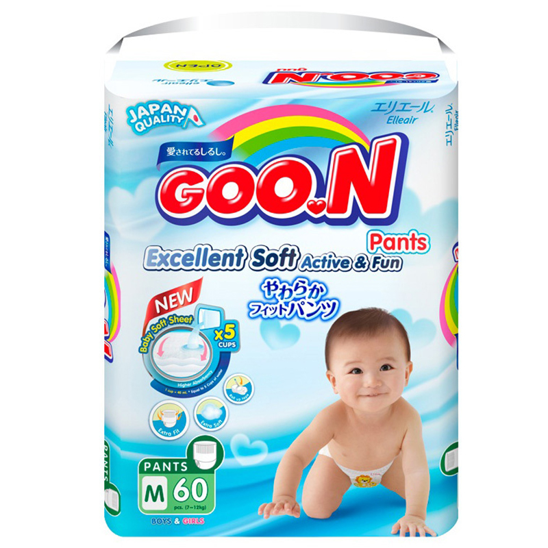 - Đóng gói: 60 miếng tã quần size M cho bé từ 7 - 12kg