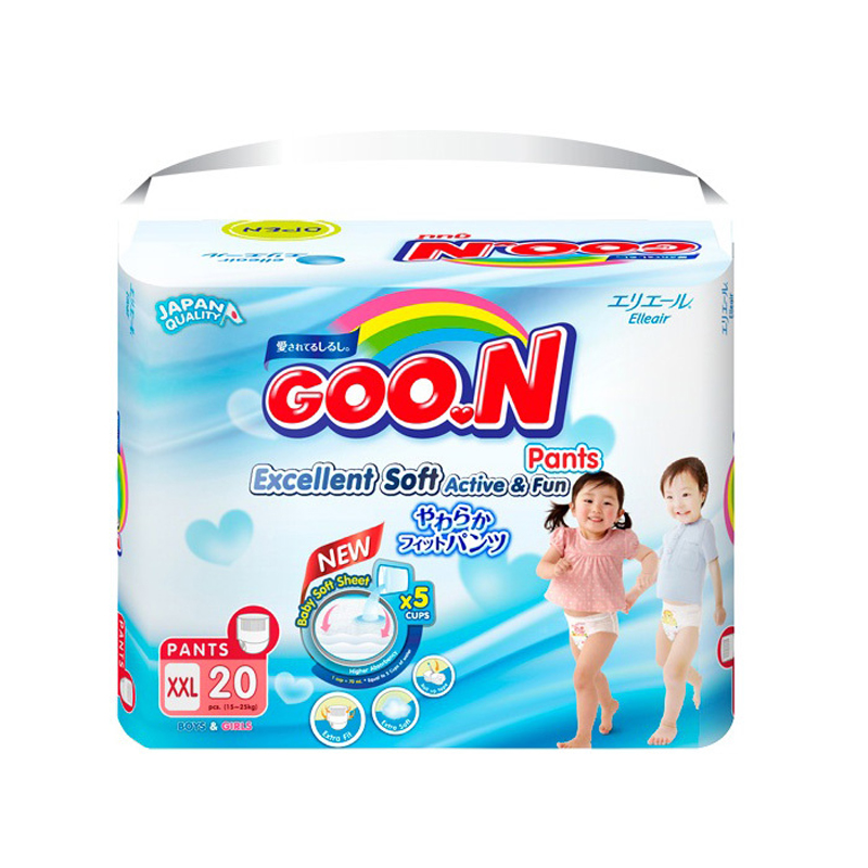 Đối với các bé từ 13- 25 kg, phần lớn các bé rất hiếu động, việc sử dụng tã hay bỉm dán sẽ làm miếng dán bị lệch hay bị lỏng khi bé hoạt động. Vì vậy, bỉm quần Goon slim XXL20 với khả năng thấm hút vượt trội, đai lưng co dãn xung quanh đùi và eo, mềm mại và vừa vặn sẽ là sự lựa chọn của nhiều mẹ hiện nay.
