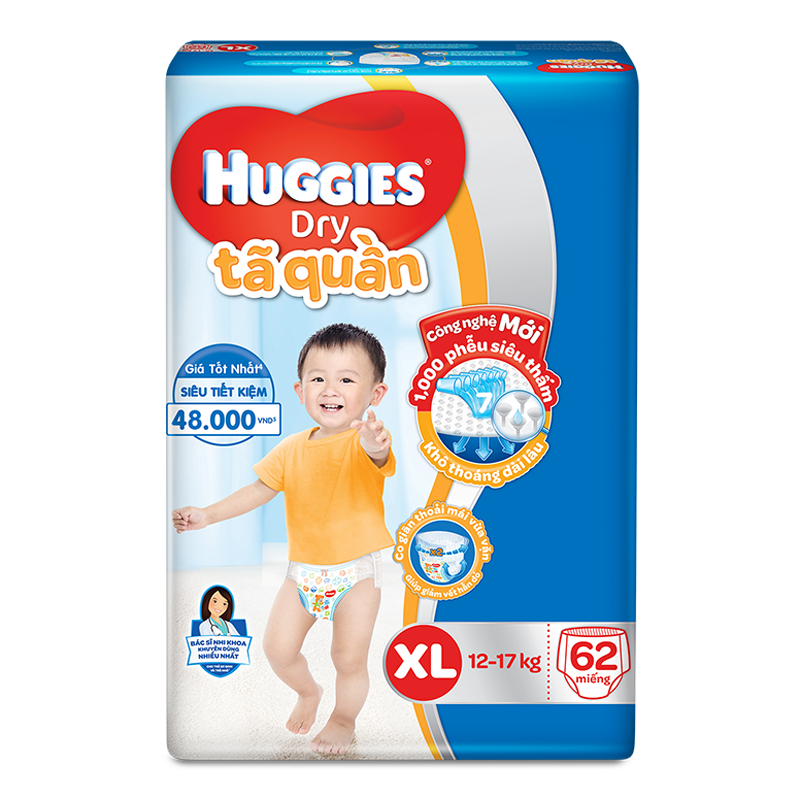 Bỉm quần Huggies Dry XL62 được các chuyên gia hàng đầu của hãng Huggies thiết kế với bề mặt bên trong có khả năng Siêu thấm hút. thấm hút tăng cường, khóa chặt chất lỏng bên trong và ngăn thấm ngược vào cơ thể trẻ nhỏ. Sản phẩm tiện dụng, đơn giản, giữ vệ sinh, thấm hút tốt và sử dụng 1 lần, đem đén sự hài lòng tuyệt đối cho các bậc cha mẹ. Tã quần Huggies đem đến cảm giác thoải mái dễ chịu mỗi khi bé vui chơi, hoạt động, mà da bé vẫn luôn khô ráo và thơm tho.