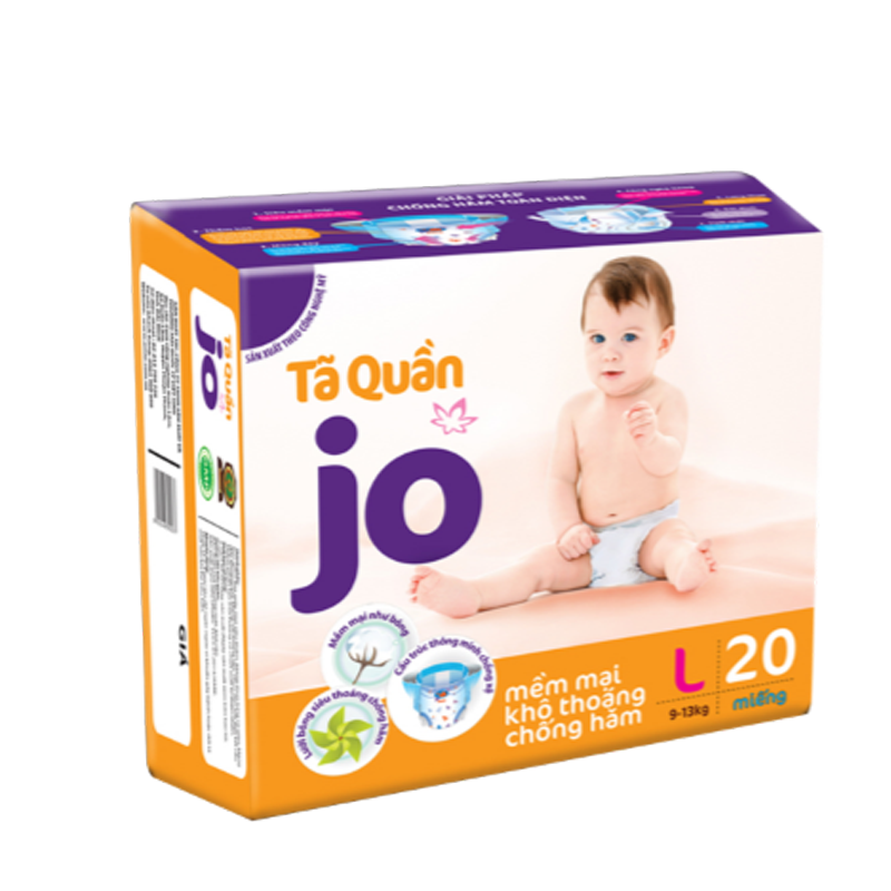 Bỉm quần Jo L20 gồm 20 miếng tã size L cho trẻ từ 9-13kg. Bỉm được thiết kế như một chiếc quần ngộ nghĩnh, giúp bé thoải mái khi vận động, vui chơi, nhất là những bé hiếu động đồng thời sử dụng công nghệ nano và đạt chuẩn GMP tạo ra một môi trường kháng khuẩn, chống hăm cho trẻ.