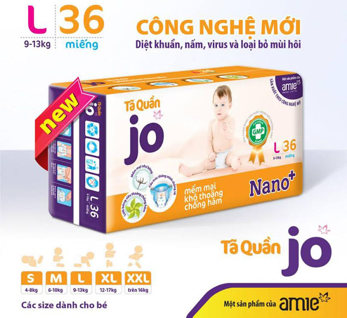 Tã quần Jo L36 được sản xuất theo công nghệ của Hoa Kì với nguyên liệu ngoại nhập 100%, siêu thấm hút, an toàn cho bé. Đặc biệt, bỉm áp dụng công nghệ NANO giúp kháng khuẩn, nấm, virus và loại bỏ mồ hôi, ngăn ngừa hăm tã ở trẻ.