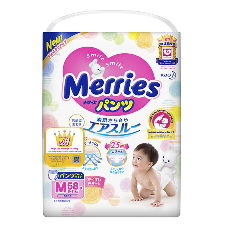Bỉm quần Merries M58 được sản xuất theo công nghệ Nhật Bản an toàn và không gây kích ứng da dành cho các bé