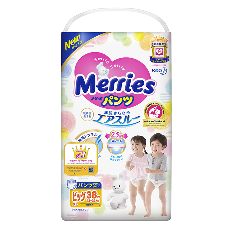 Bỉm quần Merries XL38 được sản xuất theo công nghệ Nhật Bản an toàn và không gây kích ứng da dành cho các bé từ 12kg - 22kg