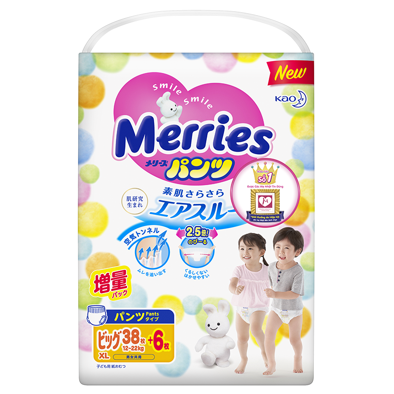 Bỉm quần Merries XL38 + 6 miếng với bao bì mới, thêm 6 miếng bỉm mà vẫn giữ nguyên mức giá, bé dùng được lâu hơn, mẹ tiết kiệm chi phí hiệu quả hơn. Tã quần Merries với công nghệ vượt trội cùng tiêu chí tiên phong “Luôn mềm mại và thông thoáng cho da bé” luôn mang đến sự thông thoáng, mềm mại tuyệt vời cho làn da mỏng manh của bé và giúp bé linh hoạt trong mọi chuyển động, tự do vui đùa.