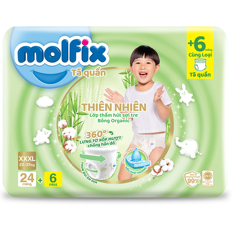 Tã - Bỉm quần Molfix XXXL24 cho bé từ 20-35kg với các nguyên liệu mềm mại vượt trội, nhẹ nhàng ôm lấy và bảo vệ làn da bé yêu ngay từ lần chạm đầu tiên Bề mặt tã có thành phần từ bông Organic* siêu mềm. Lớp dẫn thấm tăng cường siêu khô thoáng với thành phần sợi tre tự nhiên.