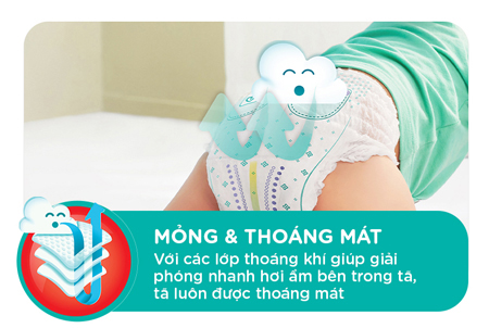 Tã có các lớp thoáng khí giúp giải phóng nhanh hơi ẩm bên trong tã, giữ cho tã luôn khô thoáng mát.