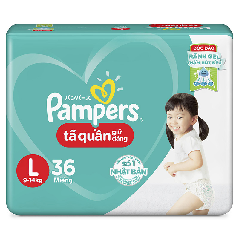Bỉm quần Pampers L36 (9-14kg) được ứng dụng công nghệ Rãnh Gel giúp thấm hút nhanh và dàn đều nước tiểu của bé, luôn mỏng nhẹ, chống xệ và chống tràn nước tiểu. Công nghệ này giúp bé dễ dàng tập đi mà không lo hai hàng.