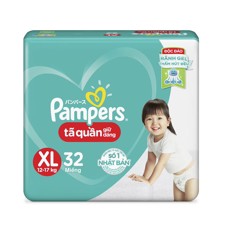 Bỉm quần Pampers XL32 (12-17kg) được đầu tư nghiên cứu và phát triển dựa trên nhu cầu thực tế với mong muốn hỗ trợ bảo vệ sức khỏe của bé giai đoạn những năm đầu đời. Ứng dụng công nghệ Rãnh Gel, tã quần Pampers Giữ Dáng giúp thấm hút nhanh và dàn đều nước tiểu của bé, luôn mỏng nhẹ, chống xệ và chống tràn nước tiểu.