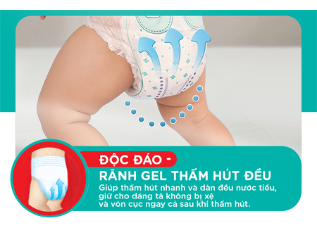 Với công nghệ Rãnh Gel , tã quần Pampers Giữ Dáng giúp thấm hút nhanh và dàn đều nước tiểu của bé, giúp giữ dáng tã luôn mỏng nhẹ, chống xệ và chống tràn nước tiểu. Giúp bé dễ dàng tập đi mà không lo hai hàng.