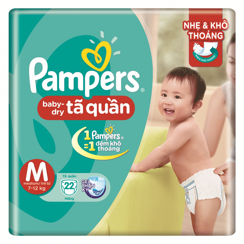 Bỉm quần Pampers M22 gồm 22 miếng tã dành cho bé từ 7 - 12kg, với lớp “lõi thần kỳ” với khả năng thấm hút tốt (đến 10 tiếng mà vẫn khô thoáng). Bỉm Pampers được tăng cường miếng lót siêu thấm - thấm hút đến 6 lần bé tè và giữ bề mặt da bé khô thoáng thơm mát đến sáng. Với mặt đáy mềm mại như bông và miếng dán nhiều lần vẫn chắc chắn, tã Pampers chính là sản phẩm giúp bé thoải mái ngủ, chơi đùa mà mẹ không mất quá nhiều thời gian để chăm sóc bé.