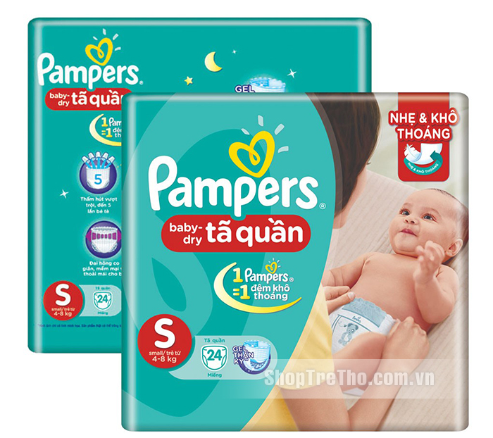 Tã quần Pampers S24 dành cho trẻ từ 4-8 kg. Bỉm Pampers với lớp “lõi thần kỳ” với khả năng thấm hút tốt (đến 10 tiếng mà vẫn khô thoáng), đặc biệt là rất mỏng, mềm, nhẹ nên rất thoải mái cho bé khi phải mặc trong thời gian dài. Pampers được tăng cường miếng lót siêu thấm - thấm hút đến 6 lần bé tè và giữ bề mặt da bé khô thoáng thơm mát đến sáng. Với mặt đáy mềm mại như bông và miếng dán nhiều lần vẫn chắc chắn, tã Pampers chính là sản phẩm giúp bé thoải mái ngủ, chơi đùa mà mẹ không mất quá nhiều thời gian để chăm sóc bé.