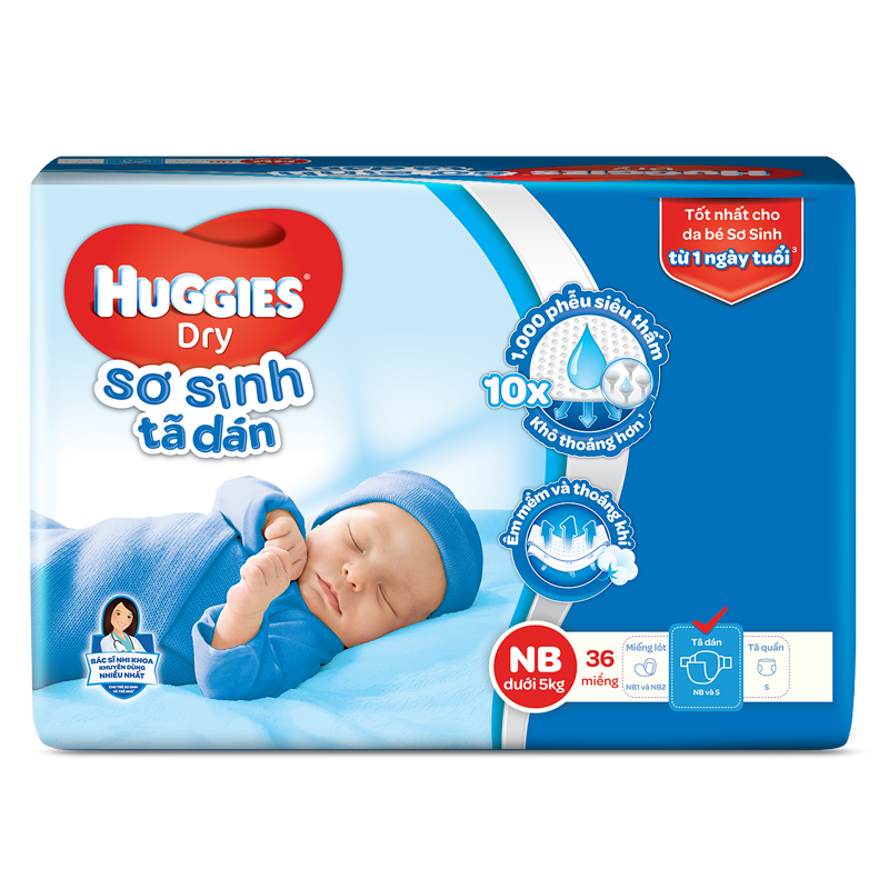 - Tã dán sơ sinh size NB dùng cho bé ngay từ ngày đầu tiên chào đời, thấm hút nhanh hơn gấp 4 lần, bề mặt siêu mềm mại nâng niu làn da non nớt