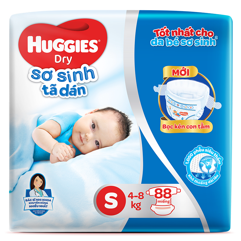 Tã dán sơ sinh Huggies với 1000 phễu siêu thấm, khô thoáng dài lâu