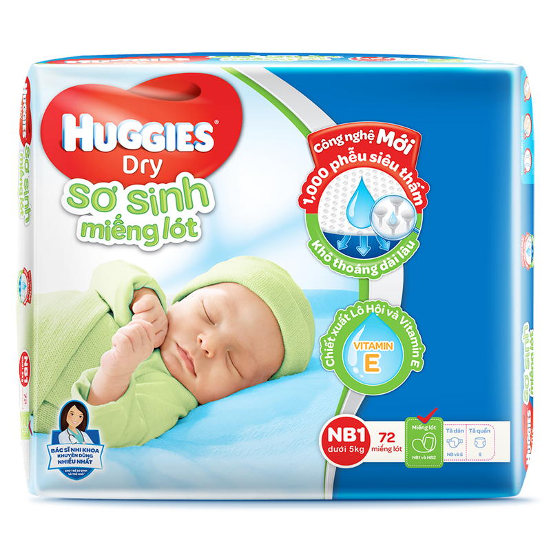 Tã giấy Huggies NB1 (72 miếng) với màng đáy thoát ẩm 100% cho phép không khí lưu thông dễ dàng, thoát khỏi màng đáy nhanh chóng giúp giữ da bé luôn khô thoáng và ngăn ngừa hăm tã hiệu quả. Dải băng keo mới dài hơn và dính chắc hơn giúp định vị miếng lót, tăng khả năng chống tràn ngay cả khi bé hiếu động. Hương thơm nhẹ nhàng, an toàn với da bé sơ sinh và giúp làn da bé luôn thơm mát.