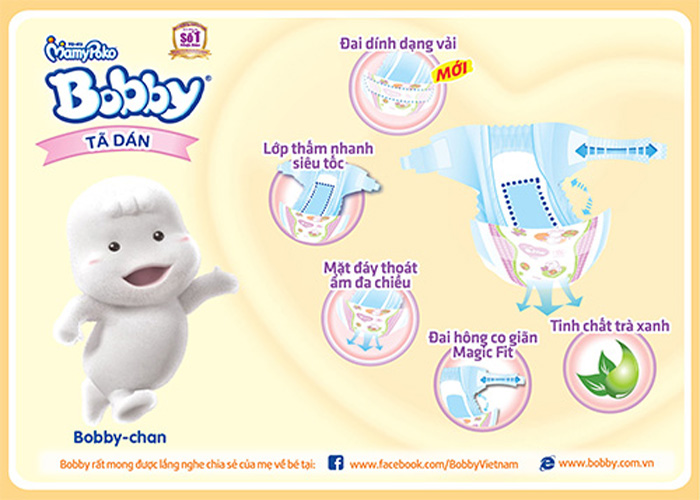 Bobby là thương hiệu về các sản phẩm tã giấy, khăn giấy ướt dành cho trẻ nhỏ của tập đoàn Unicharm - nhà sản xuất tã lót hàng đầu Nhật Bản, bắt đầu kinh doanh từ năm 1961. Sản phẩm của Bobby được thiết kế chuyên biệt cho từng giai đoạn phát triển của bé và được làm từ các chất liệu an toàn. Với hệ thống phân phối tại hơn 80 quốc gia, trong nhiều năm qua, Bobby đã hỗ trợ đắc lực cho hàng triệu bà mẹ trên toàn thế giới trong việc chăm sóc bé yêu.