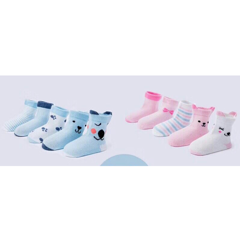 Tất lưới cao cổ cho bé (5 đôi/sét) với chất liệu sợi cotton mềm mại với kiểu dệt lưới, đảm bảo không làm trẻ bị bí bết mồ hôi nên đặc biệt thích hợp để các bé sơ sinh mang theo khi ngủ, tránh bị lạnh chân hoặc bé mang theo khi đi giày thể thao. Sản phẩm gồm set 5 đôi với họa tiết khác nhau để mẹ thay đổi cho bé.