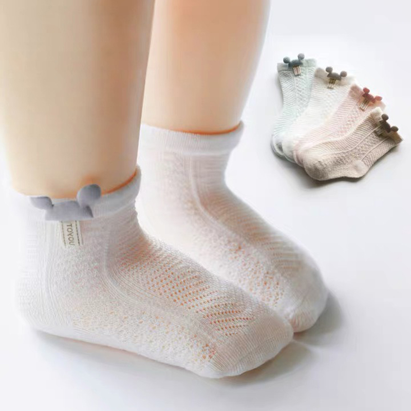- Chất liệu: vải cotton kết hợp sợi Spandex co giãn, mềm mại, thấm hút mồ hôi. Kiểu dệt lưới đảm bảo độ thoáng cho đôi chân của trẻ
