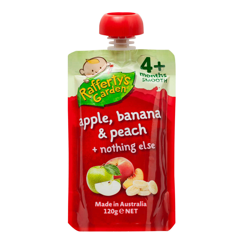 Thức ăn dinh dưỡng Rafferty's Garden - Táo, chuối, đào (4m+) được nghiền từ 100% trái cây tự nhiên, sẽ là thực phẩm bổ sung dành cho bé từ 4 tháng trở lên. Đặc biệt, tất cả các nguyên liệu đều đáp ứng tiêu chuẩn Organic, hoàn toàn hữu cơ, thân thiện với môi trường, an toàn cho bé yêu.