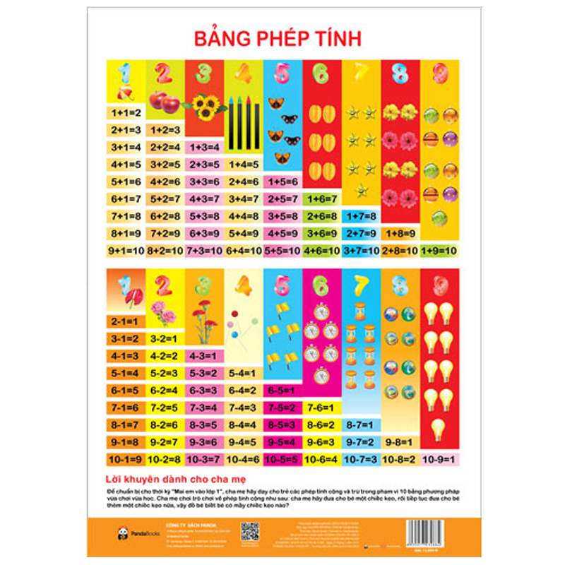 Tờ poster bảng phép tính phù hợp với lứa tuổi mẫu giáo lớn và đầu tiểu học giúp bé mở rộng vốn tư duy toán học ở các kiến thức khác nhau.