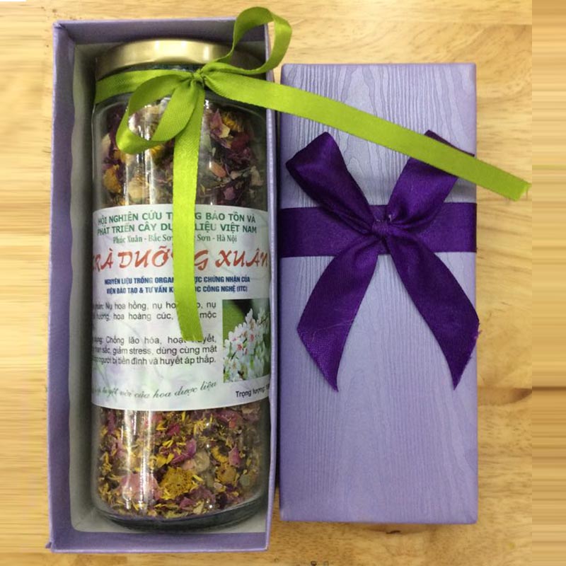 Trà Dưỡng Xuân được phối trộn theo tỷ lệ giữa nụ hoa hồng, nụ hoa đào, nụ hoa oải hương, hoa hoàng cúc, hoa mộc hương... Sự kết hợp hài hòa từ thiên nhiên này đã mang đến một loại trà thảo dược ngon với những công dụng tuyệt vời như: chống lão hóa, hoạt huyết, dưỡng nhan sắc, giảm stress, dùng cùng mật ong sẽ rất tốt cho người bị tiền đình và huyết áp thấp.